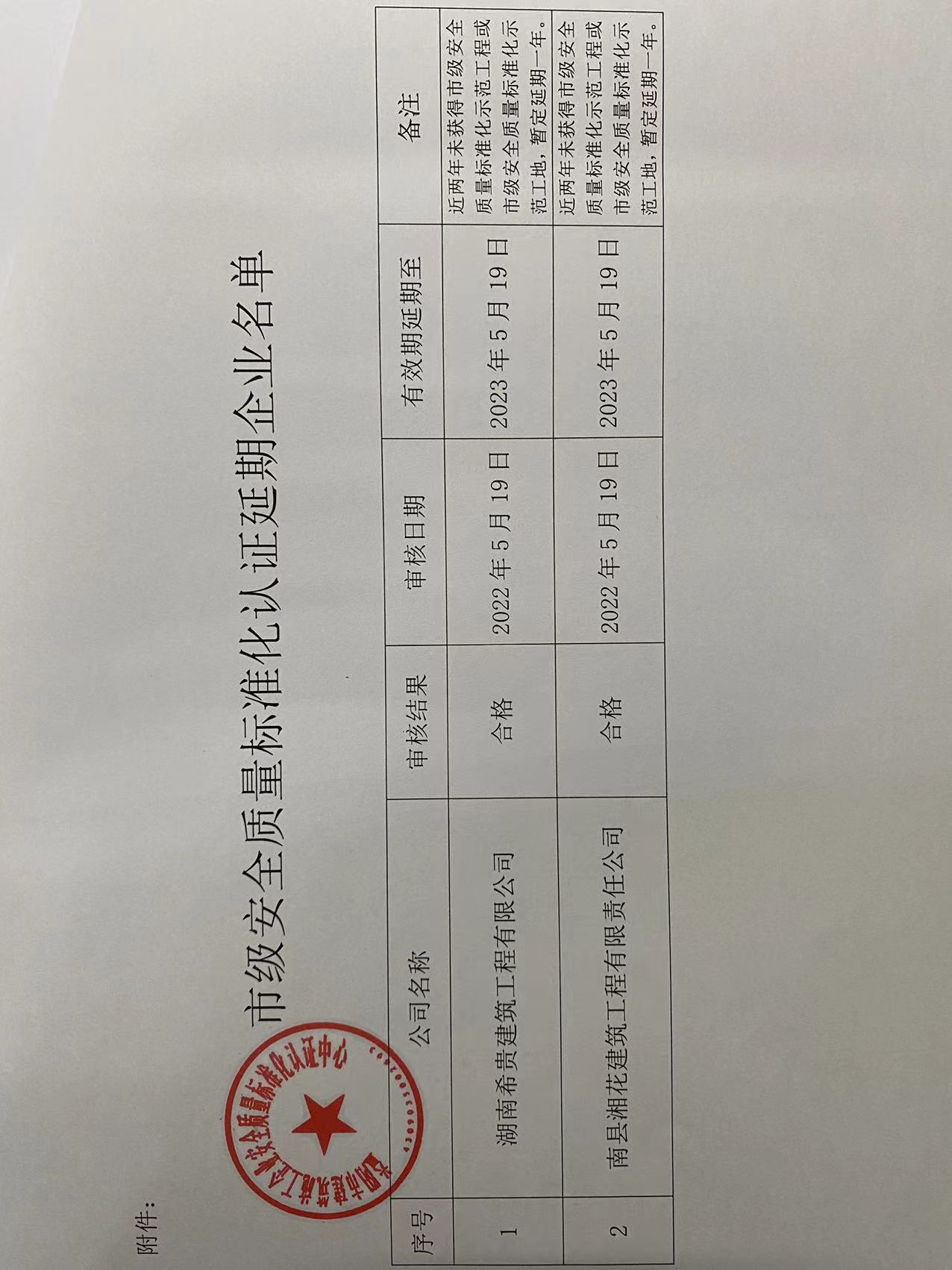 关于同意湖南希贵建筑工程有限公司等两家建筑施工企业市级安全质量标准化认证延期的通知